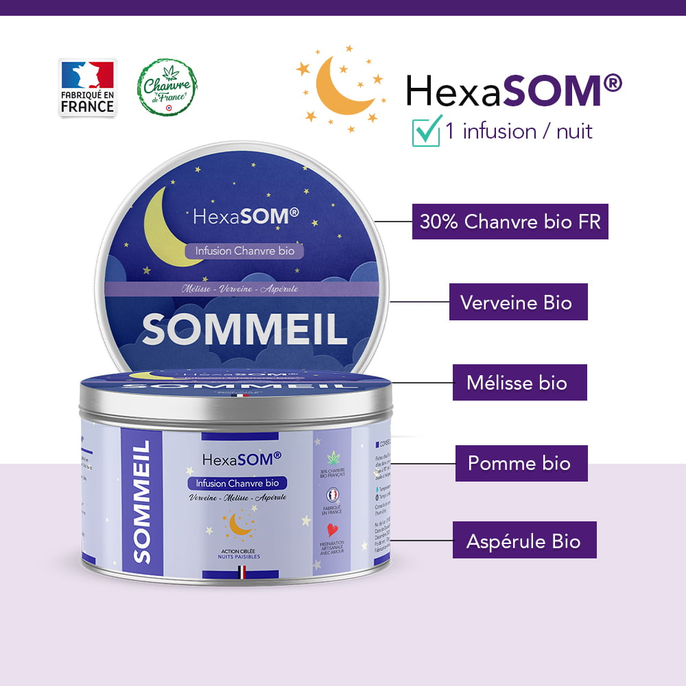 Formulée par des herboristes experts, l'infusion HexaSOM® combine 30% de chanvre bio français avec une synergie de plantes sélectionnées pour leurs propriétés relaxantes. Verveine, mélisse et aspéule s'unissent aux fruits séchés pour créer une infusion au goût fruité qui favorise un endormissement rapide et un sommeil réparateur.